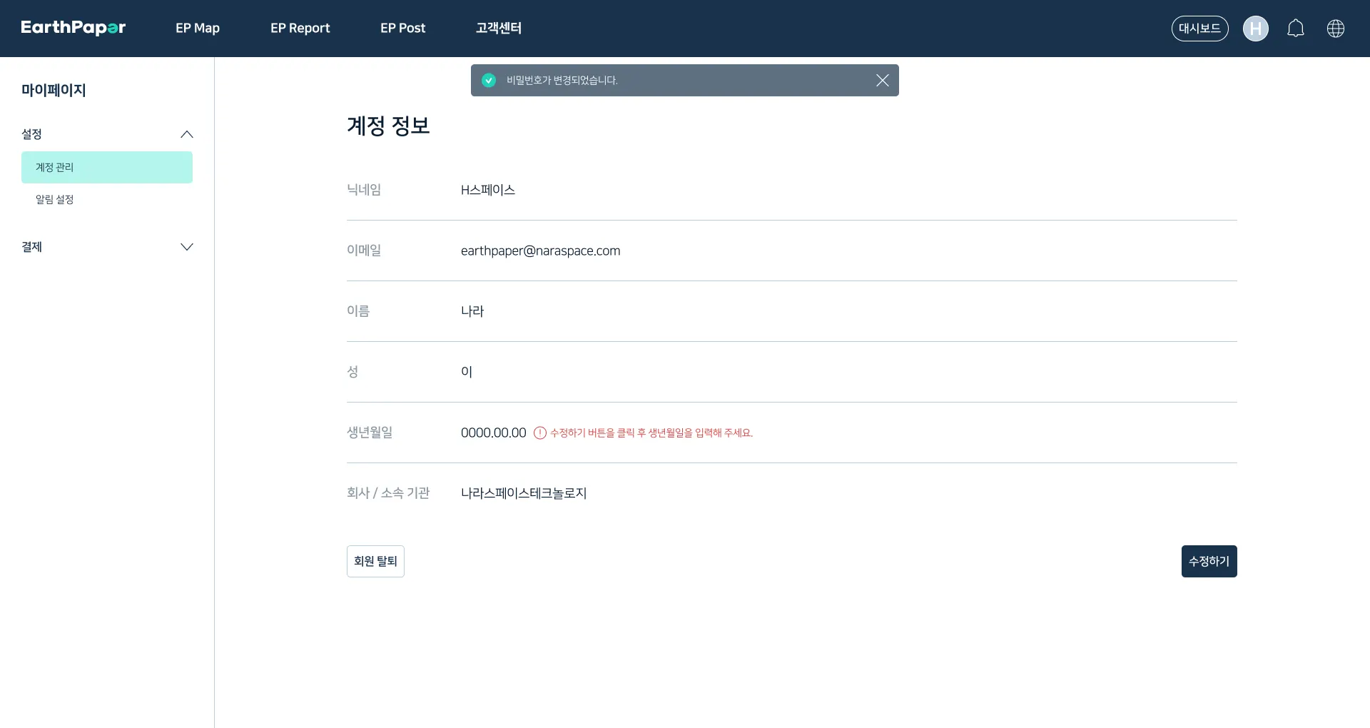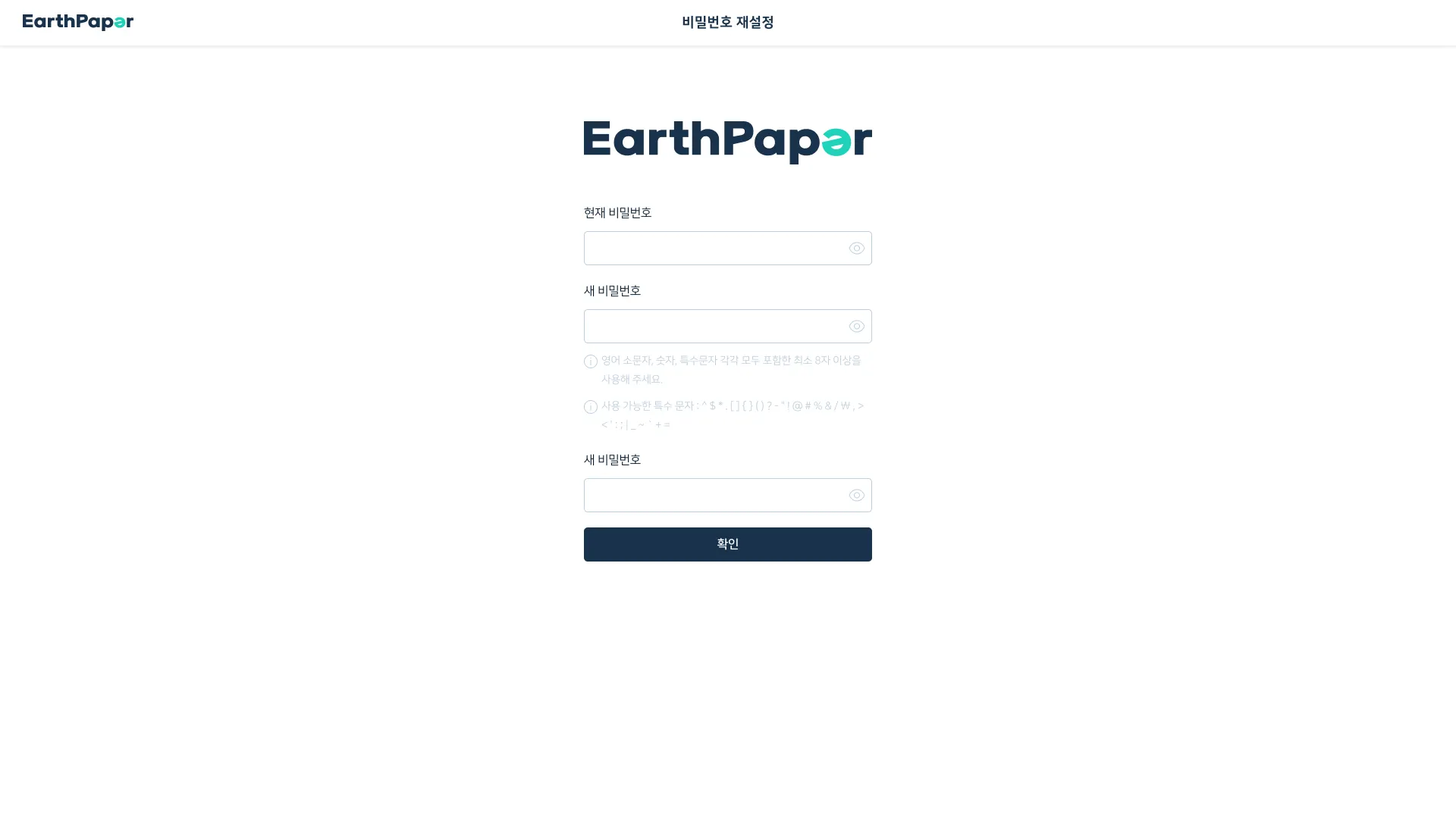 EarthPaper 마이페이지에서 비밀번호를 변경할 수 있습니다.